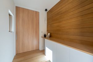 木目と白を組み合わせた、かわいくてほっこりする玄関。木のぬくもりが感じられ、訪れる人をやさしく迎え入れます。ひかえめなペンダントライトが空間に温かみをプラス。木目のリビングドアを天井までのハイドアにすることで、玄関全体が明るく広く感じられるデザインです。