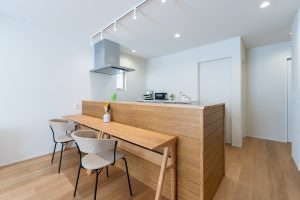 白と木目を組み合わせた内装が、ナチュラルで落ち着いた雰囲気を演出するLDK。スライドドアで隠せるリビング収納を設け、すっきりと片付く空間を実現しました。キッチンカウンターの木目がアクセントとなり、シンプルながらもデザイン性の高い仕上がり。コンパクトながら開放感があり、家族との時間をゆったり過ごせる心地よい空間です。