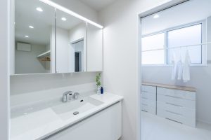 広々とした洗面台に、タッチレスライトを採用。手をかざすだけでライトのオン・オフができ、忙しい朝もストレスフリーです。キャビネットはフルスライドタイプで、たっぷり収納可能。よく使う小物もインナー引き出しでサッと取り出せるなど、使い勝手にこだわった洗面室です。